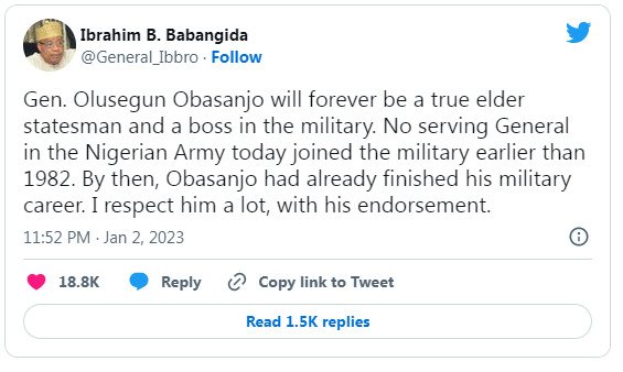 In a parody account allegedly used by Babangida, but actually belonging to a Twitter subscriber, @General_Ibbro, the former Nigerian leader was claimed to have said: